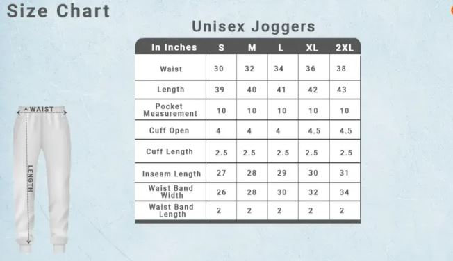 | Size | Waist | Length | Pocket Measurement | Cuff open | Cuff Length | Inseam Length | Waist Band Width | Waist Band Length |